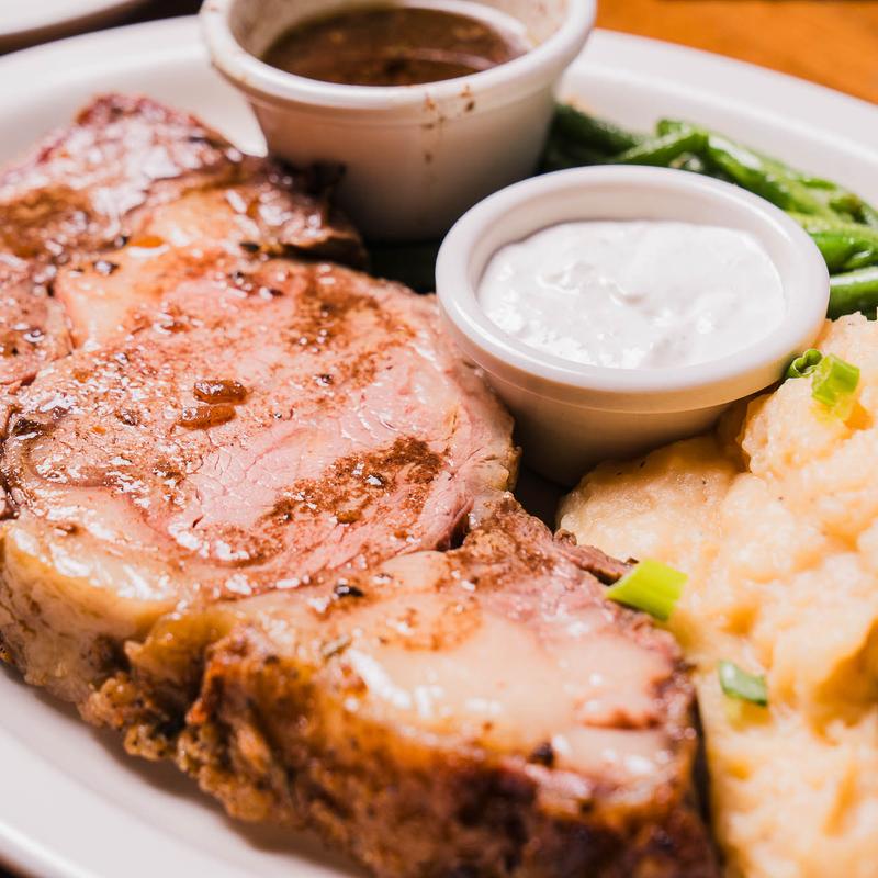 Mashed potatoes, chef’s veggies, horseradish cream, au jus | Add a House Salad or Cup of Soup +$6.99 (Friday and Saturday Nights)